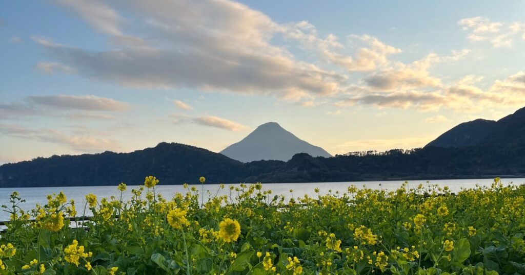 知覧の空、開聞岳の雄姿、そして菜の花の黄色い絨毯。