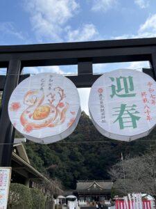 境内には「迎春」の大きな看板が掲げられ、歴史の重みを感じさせつつも、新しい年を祝う清々しい活気に満ちていました。