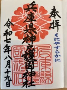 鮮やかな朱色の菊花が、社殿の白さと対比をなすように美しく捺されており、護國神社としての格式の高さを物語っています。 - 兵庫縣神戸護國神社の印