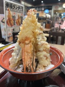 駅構内の「天ぷら串焼海鮮 米福」で注文したのは、見上げるような高さでそり立つ「エビ天丼」。
