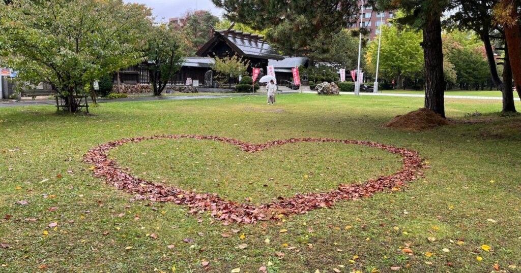 そこにあったのは、色とりどりの落ち葉で描かれた、見事な「ハートマーク」。